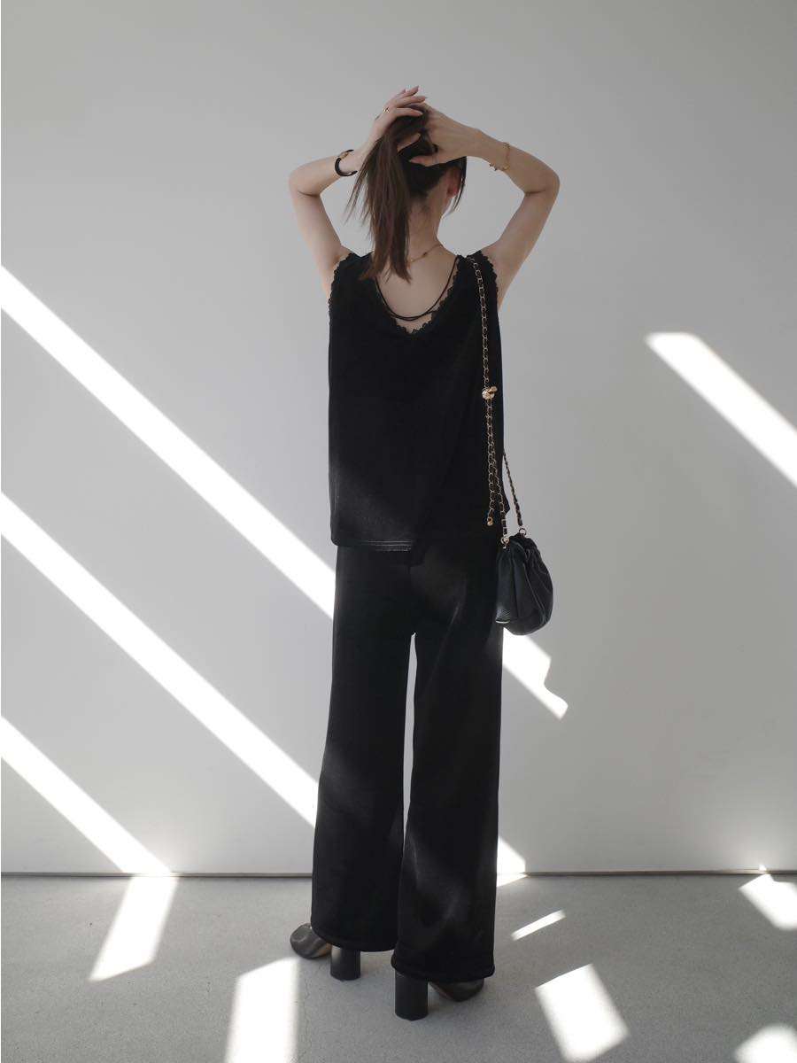 予約商品です ※10月22日以降、順次発送予定の商品です。 ※入荷状況により発送が前後する場合がございます。 ※複数の商品を同時にご注文の場合、全ての商品が揃い次第の発送となりますのでご注意ください。 【デザイン&ディテールポイント】 シーズンムード高まるベルベット素材のセットアップ。 トップスは、レースのネックラインが大人フェミニンなデザイン。 落ち感のあるストレートシルエットのパンツを合わせることで、洗練されたムードに。 リラックス感がありながらも、ベルベット素材が品のある大人な印象に仕上げてくれます。 【コーディネートポイント】 ブラックのワントーンでまとめることで、甘すぎずモード感のあるコーディネートに。 アクセサリーや小物使いで、アクセントをプラス。 セットアップとしての着用はもちろん、単品でも活躍するアイテムなので着回し力も抜群です。 ※セットでの購入は単品買いに比べ約3,000円お得に購入ができます。 着用アイテム ■tops velvet lace tank top ■pants velvet long pants ※その他のアイテムはモデル私物です。 ■素材 ポリエステル100% ■サイズ詳細(cm) ・tops 着丈:55 肩幅:30 バスト:94 ・pants ウエスト:64(伸ばして90) ヒップ:96 股上:33 股下:64 わたり:29 ■原産国 中国 モデル身長 158cm