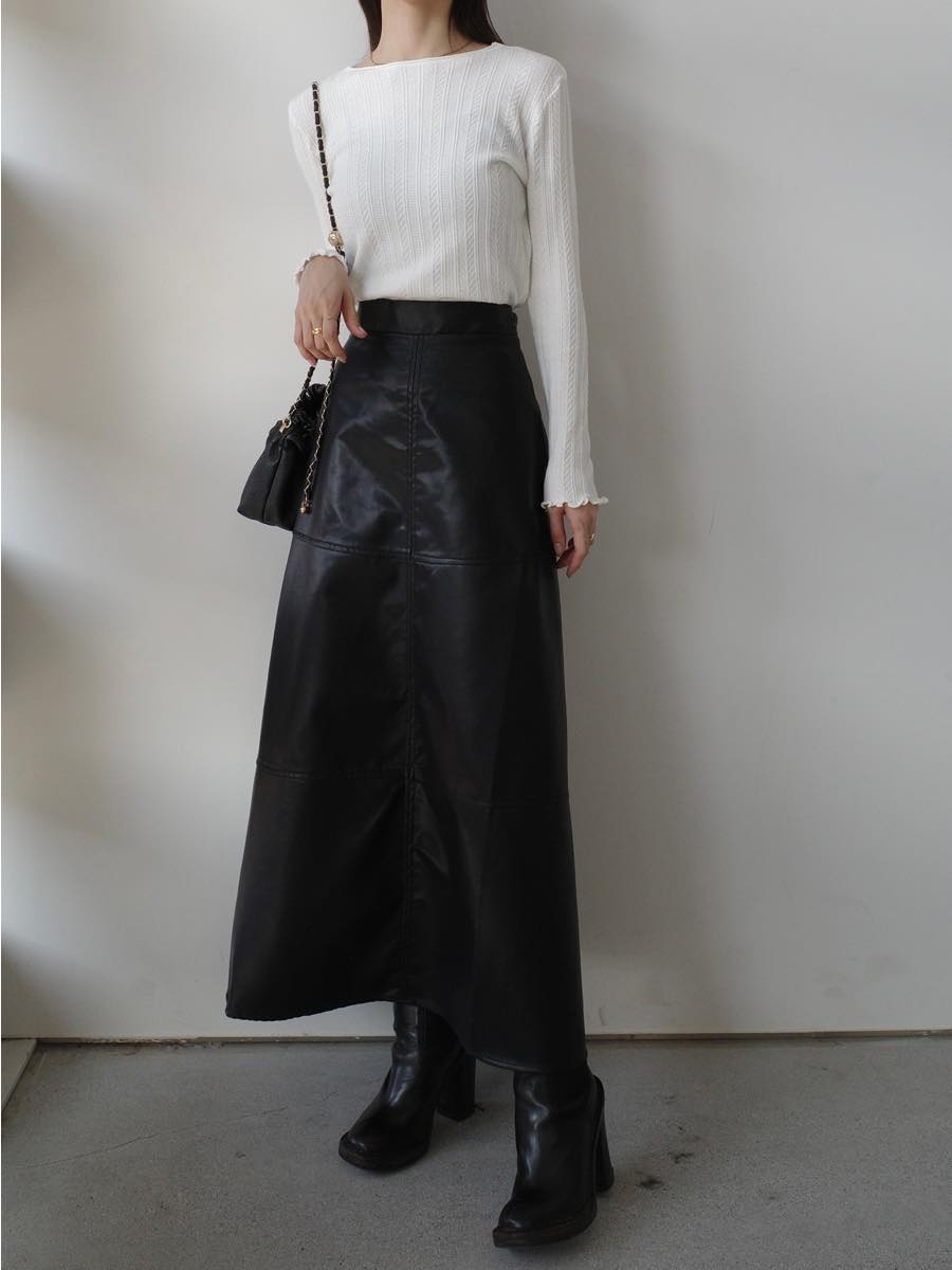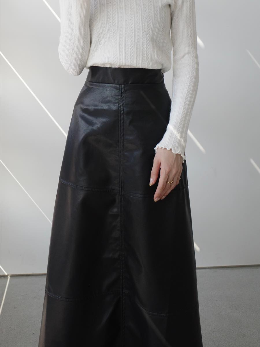 【デザイン&ディテールポイント】 しなやかな質感が特徴のエコレザーを使用したフレアスカート。 高級感のあるマットな仕上がりが、洗練された印象を演出します。 ウエスト部分はすっきりとしたハイウエスト仕様で、スタイルアップ効果も抜群。 パネル切り替えによって自然な広がりを持たせたAラインシルエットが、動くたびにふわっと広がります。 【コーディネートポイント】 フェミニンなニットやブラウスと合わせてきれいめにまとめるのはもちろん、スウェットやTシャツと合わせたカジュアルスタイルにも馴染む万能アイテム。 ショート丈トップスと合わせれば、スタイルアップが叶うトレンド感のある着こなしに。 足元にブーツを合わせると、シーズンムード高まるスタイルが完成。 季節を問わず、シーズンレスで活躍する1枚です。 着用アイテム ■tops mellow line lace rib knit / white ※その他のアイテムはモデル私物です。 ■素材 合成皮革100% ■サイズ詳細(cm) ウエスト:64 ウエストゴム最大:78 裾巾(カーブ):90 レングス(ベルト下):85 レングス脇(ベルト下):88 ■原産国 中国 モデル身長 158cm