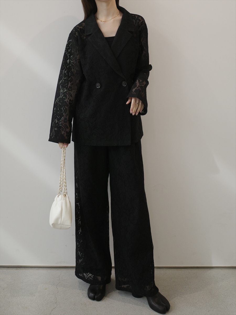 【デザイン&ディテールポイント】 繊細なレースを贅沢に使用した、大人のためのセットアップ。 テーラードジャケットのきちんと感と、イージーパンツのリラックス感を絶妙にミックスし、抜け感のある洗練スタイルを演出します。 上下ともに軽やかな透け感があり、重たくならず春夏シーズンにも快適。 セットで着るだけでコーディネートが完成する、頼れる一着です。 それぞれ単品使いもできるため、着回し力も抜群。 ジャケットは羽織として、パンツは主役ボトムとして、幅広いスタイリングに対応します。 カラーはクリーンで女性らしい「ホワイト」と、シックでモードな「ブラック」の2色展開。 シーンや気分に合わせて選べます。 おすすめシーン ・デイリーコーデ ・カフェやショッピング ・旅行・リゾートスタイル ・ちょっとしたお呼ばれにも ポイント ・セットで即完成するスタイリング ・単品でも使える高い着回し力 ・軽やかでストレスフリーな着心地 ・華やかさと大人っぽさを兼ね備えた一着 ホワイト、ブラックの2色展開。 ※セットでの購入は単品買いに比べ4,800円お得に購入ができます。 セットアップ/ホワイトはこちら sheer flower lace set up / white 着用アイテム ジャケット sheer flower lace jacket / black パンツ sheer flower lace pants / black ■bag ball chain shoulder bag / black ※その他のアイテムはモデル私物です。 ■素材 表地: ポリエステル41% 綿38% レーヨン16% 再生繊維(セルロース)5% パンツ裏地: ポリエステル100% ■サイズ詳細(cm) ジャケット: 着丈67 肩幅47 袖丈56 バスト104 パンツ: ウエスト66(伸ばして102) ヒップ106 股上33 股下69 わたり32 ■原産国 中国 モデル身長 158cm