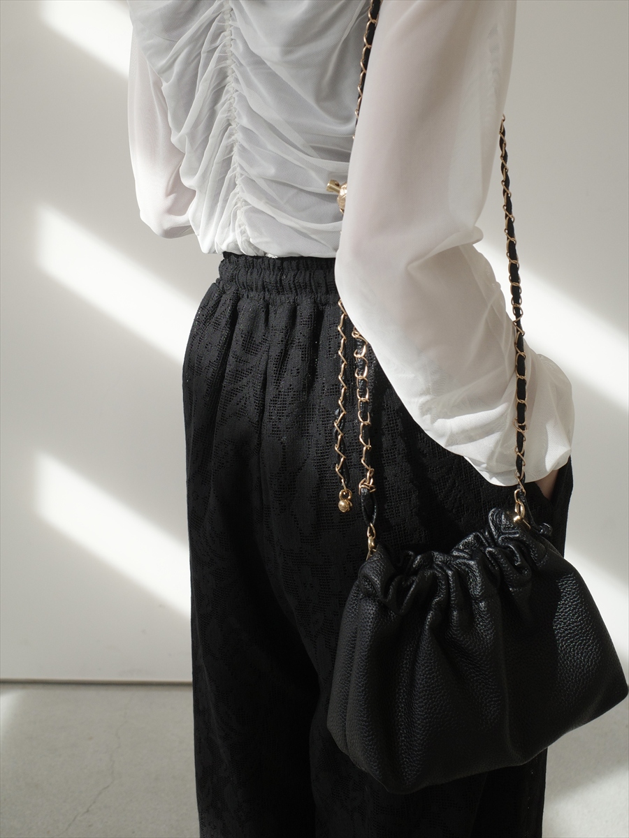 【デザイン&ディテールポイント】 上品な透け感が魅力の総レースパンツ。 リラックス感のあるワイドシルエットながら、縦のラインを美しく見せ、スタイルアップを叶えます。 ウエストはドローストリング仕様で、ストレスフリーな履き心地。 軽やかな素材感で動くたびに揺れ、女性らしい柔らかさを演出します。 シンプルなトップスと合わせるだけで、コーディネートが華やぐ主役アイテム。 カジュアルにもキレイめにも振れる万能さが魅力です。 同素材のジャケットと合わせれば、統一感のある洗練されたスタイルに。 ポイント ・繊細な総レースで上品な印象 ・ウエストゴム+紐で快適な着用感 ・脚のラインを拾わないワイドシルエット ・裏地付きで安心感◎ ・単品でもセットアップでも活躍 ホワイト、ブラックの2色展開。 ※セットでの購入は単品買いに比べ4,800円お得に購入ができます。 ホワイトはこちら sheer flower lace pants / white セットアップ/ホワイトはこちら sheer flower lace set up / white セットアップ/ブラックはこちら sheer flower lace set up / black 着用アイテム ■bag ball chain shoulder bag / black ※その他のアイテムはモデル私物です。 ■素材 表地: ポリエステル41% 綿38% レーヨン16% 再生繊維(セルロース)5% 裏地: ポリエステル100% ■サイズ詳細(cm) ウエスト66(伸ばして102) ヒップ106 股上33 股下69 わたり32 ■原産国 中国 モデル身長 158cm