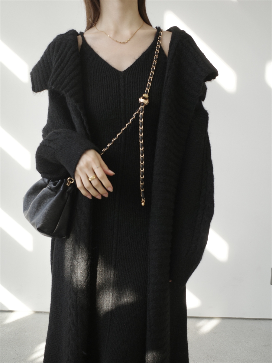 【デザイン&ディテールポイント】 ふんわりと包み込むような柔らかなニット素材を使用した、ロングワンピースとロングカーディガンのセットアイテム。 ワンピースは身体のラインを綺麗に見せるシルエットで、上品なVネックがデコルテをすっきりと演出。 カーディガンは立体感のある編地切り替えとケーブルデザインを施し、動きのある表情をプラス。 別々にもセットでアンサンブルとしても着用できる、着回しが楽しめるアイテムです。 ベージュ、グレー、ブラックの3色展開です。 【コーディネートポイント】 セットで着用すれば、温かみと上品さを兼ね備えた大人フェミニンスタイルが完成。 ワンピースはブーツを合わせるだけで季節感のあるスタイルに。 カーディガンはデニムやスラックスに羽織るなど、単品でも着回し力抜群。 バッグやシューズにブラックなど締め色を合わせるとメリハリが出て、 洗練された印象に。 ワントーンでまとめれば柔らかな女性らしさが際立ちます。 ブラックはこちら cami onepiece coatigan set / black ベージュはこちら cami onepiece coatigan set / beige 着用アイテム ■bag ball chain shoulder bag / black ※その他のアイテムはモデル私物です。 ■素材 アクリル80% ウール20% ■サイズ詳細(cm) ・カーディガン 着丈102 肩幅62 袖幅45.5 バスト120 ・ワンピース 着丈116 肩幅62 バスト50 ■原産国 中国 モデル身長 158cm