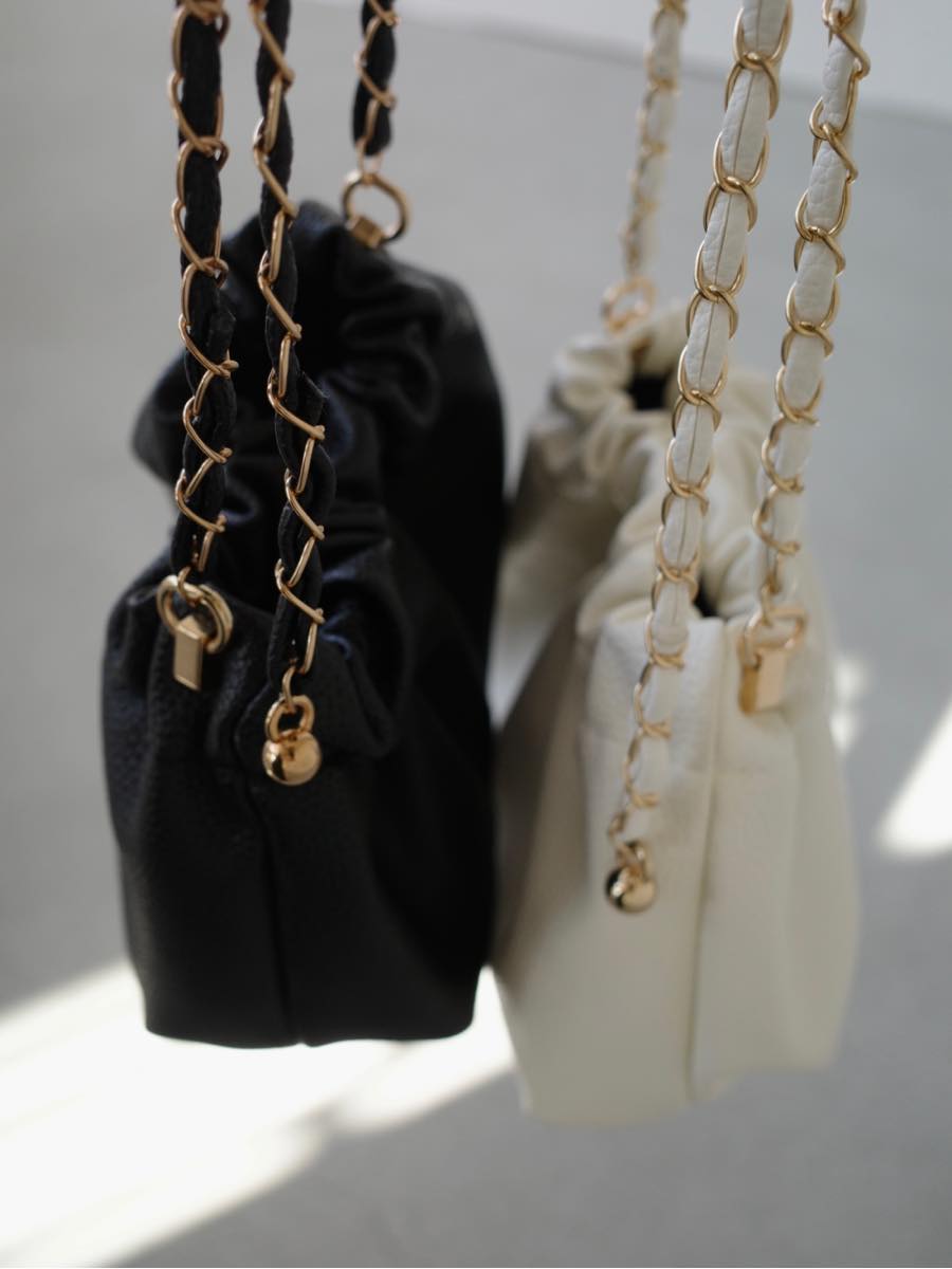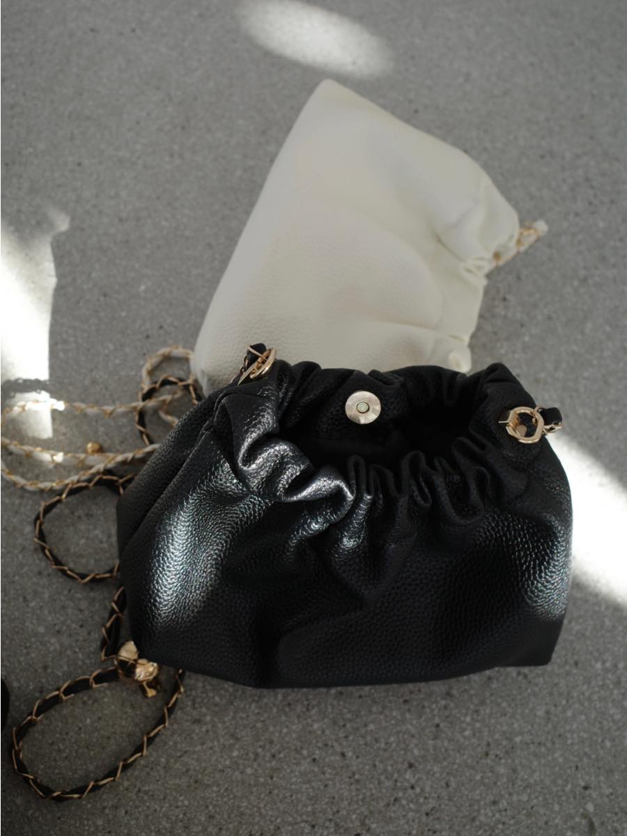 【デザイン&ディテールポイント】 ミニマルながらも存在感のあるデザインが魅力のショルダーバッグ。 シックなブラックカラーとフェイクレザー素材が、上品な印象を与えてくれます。 ゴールドのボールチェーンとブラックのリボンを編み込んだショルダーストラップは、ころんとした立体感のあるフォルムと相まって、コーディネートのアクセントになるディテール。 小ぶりながらもマチがあるため、最低限の持ち物は収納可能。 アイボリー、ブラックの二色展開。 【コーディネートポイント】 どんなスタイルにもマッチするブラックは、ひとつ持っておくと重宝する万能カラー。 ジャケットスタイルやセットアップに合わせれば、きちんと感のある印象に。 あえてカジュアルなスウェットやデニムと合わせて、抜け感を演出するのもおすすめです。 アクセサリー感覚で取り入れられる、コンパクトながら存在感のある一点です。 アイボリーはこちら ball chain shoulder bag / ivory 着用アイテム ■tops glitter off shoulder rib knit / black ■tops button v neck cardigan / ivory ■coat eco fur jacket / grey ■jacket velvet over size jacket ※その他のアイテムはモデル私物です。 ■素材 合成皮革 ■サイズ詳細(cm) 高さ15 横19 幅9 ストラップ120(調整可能) ■原産国 中国 モデル身長 158cm