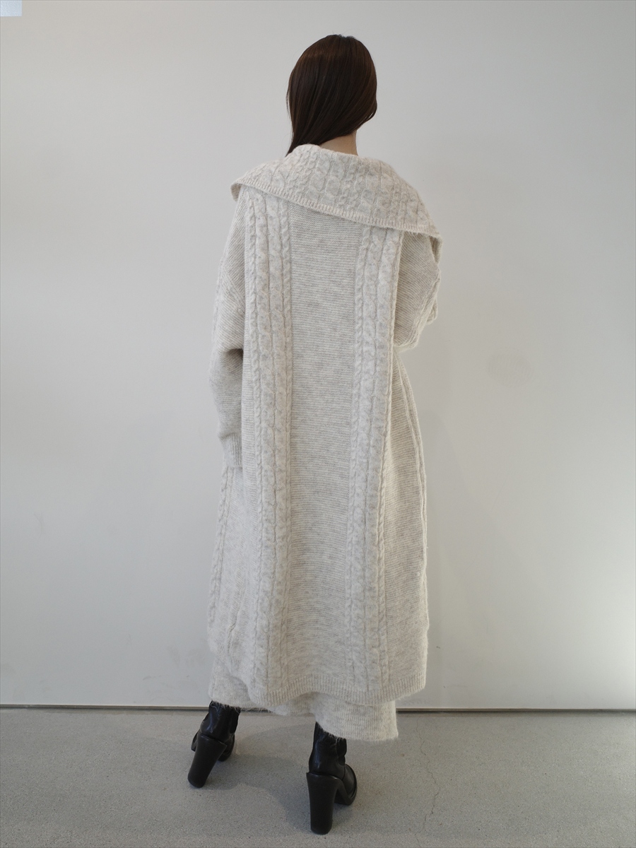 【デザイン&ディテールポイント】 ふんわりと包み込むような柔らかなニット素材を使用した、ロングワンピースとロングカーディガンのセットアイテム。 ワンピースは身体のラインを綺麗に見せるシルエットで、上品なVネックがデコルテをすっきりと演出。 カーディガンは立体感のある編地切り替えとケーブルデザインを施し、動きのある表情をプラス。 別々にもセットでアンサンブルとしても着用できる、着回しが楽しめるアイテムです。 ベージュ、グレー、ブラックの3色展開です。 【コーディネートポイント】 セットで着用すれば、温かみと上品さを兼ね備えた大人フェミニンスタイルが完成。 ワンピースはブーツを合わせるだけで季節感のあるスタイルに。 カーディガンはデニムやスラックスに羽織るなど、単品でも着回し力抜群。 バッグやシューズにブラックなど締め色を合わせるとメリハリが出て、 洗練された印象に。 ワントーンでまとめれば柔らかな女性らしさが際立ちます。 ブラックはこちら cami onepiece coatigan set / black グレーはこちら cami onepiece coatigan set / gray 着用アイテム ■bag ball chain shoulder bag / black ※その他のアイテムはモデル私物です。 ■素材 アクリル80% ウール20% ■サイズ詳細(cm) ・カーディガン 着丈102 肩幅62 袖幅45.5 バスト120 ・ワンピース 着丈116 肩幅62 バスト50 ■原産国 中国 モデル身長 158cm