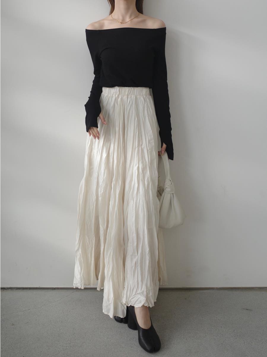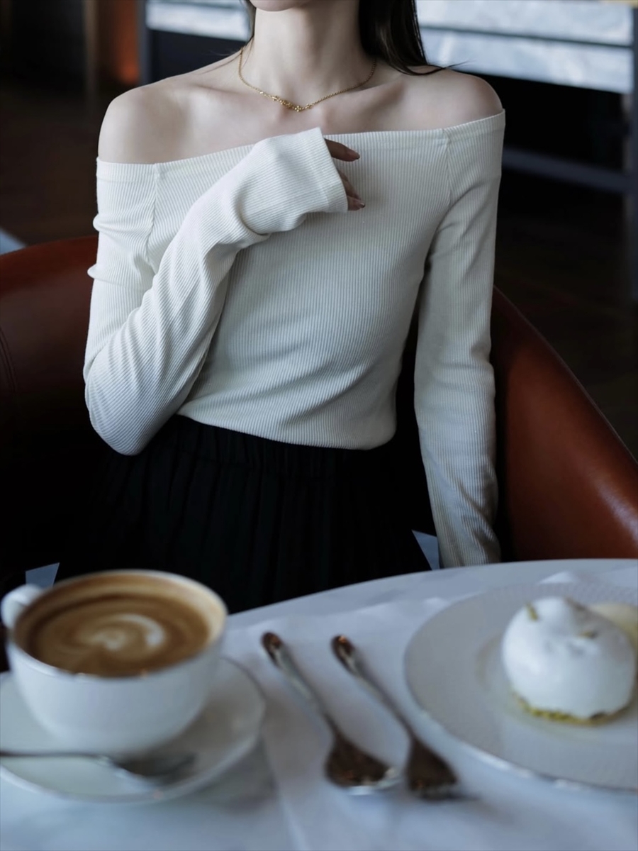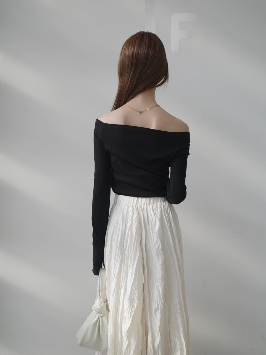 【デザイン&ディテールポイント】 程よくボディラインにフィットする、リブ素材のオフショルダートップス。 控えめなラメが光に当たるたびさりげなく輝き、上品さとモードな印象を兼ね備えた一着です。 長めのスリーブに施されたサムホールデザインが、抜け感とスタイリッシュさをプラス。 デコルテを美しく魅せるカッティングで、フェミニンながらもヘルシーな肌見せが叶います。 ブラック、グレー、アイボリーの3色展開です。 【コーディネートポイント】 一枚で着映えするデザインは、ボリュームのあるスカートと合わせて女性らしくまとめるのはもちろん、 デニムやスラックスと合わせてカジュアルダウンさせたコーデもおすすめ。 ベーシックなブラックはどんなカラーとも相性が良く、これからのシーズンでジャケットのインナーとしても活躍します。 モードな着こなしから、デイリーユースなスタイルまで幅広く対応できる万能トップスです。 グレーはこちら glitter thumbhole fit tops / grey アイボリーはこちら glitter thumbhole fit tops / ivory 着用アイテム ■skirt washer volume long skirt / ivory ※その他のアイテムはモデル私物です。 ■素材 レーヨン 41% ポリエステル 34% ナイロン 21% ポリウレタン 4% ■サイズ詳細(cm) 着丈:50 身巾:34.5 AH:17.5 袖丈:63 肩幅:30 ■原産国 中国 モデル身長 158cm