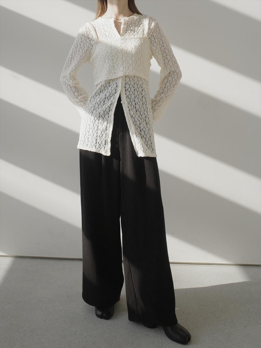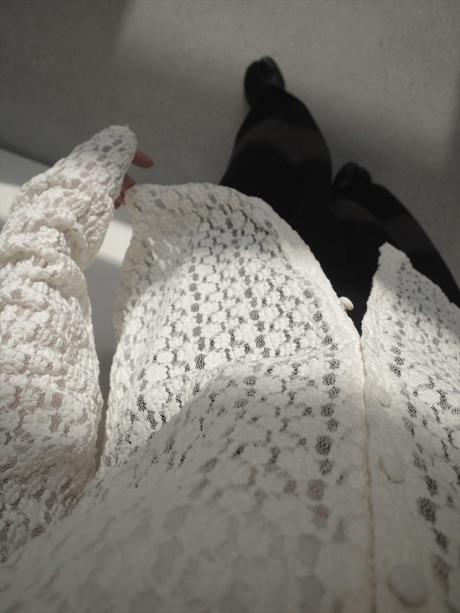 【デザイン&ディテールポイント】 繊細なレースが上品な、シアートップス。 柔らかく、立体感のあるレース編みが女性らしい雰囲気を引き立て、軽やかな印象を演出します。 ボディラインを拾いすぎない程よいシルエットで、 リラックス感とエレガントさを両立。 【コーディネートポイント】 フロントのくるみボタンがさりげないアクセントになり、羽織りとしても、 ボタンを閉めてトップス風にも着こなせます。 ビスチェも取り外し可能で、自由に着こなしが可能。 インナーとのレイヤードで印象を変えられるのも魅力。 デニムでカジュアルに、スラックスでモードに、 スカートでフェミニンにと幅広く活躍します。 カラー展開はアイボリーとブラックの2色展開。 ブラックはこちら flower emboss 2piece tops / black 着用アイテム ■pants boucle tuck pants / black ※その他のアイテムはモデル私物です。 ■素材 ナイロン56% 綿42% ポリウレタン2% ■サイズ詳細(cm) 着丈68 肩幅33 袖丈65 バスト90 ■原産国 中国 モデル身長 158cm
