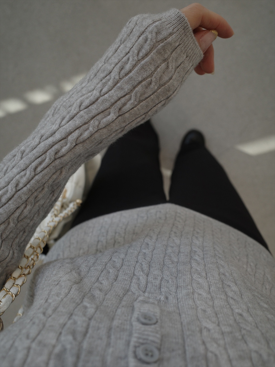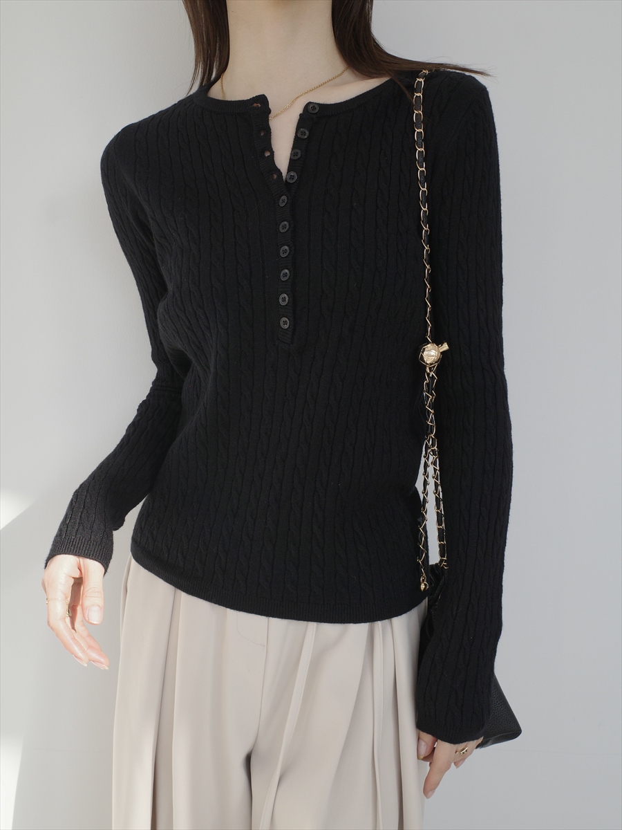 【デザイン&ディテールポイント】 繊細なケーブル編みが印象的な、フィット感のあるニットトップス。 縦に流れる編み模様がボディラインをすっきり見せ、上品でクラシカルな雰囲気を演出します。 フロントはヘンリーネック仕様で、小ぶりのボタンがさりげないアクセントに。 ボタンの開閉でネックラインの印象を変えられるのもポイントです。 程よく身体に沿うシルエットながら、窮屈感のない柔らかなニット素材。 シンプルながらも表情のある編み地で、デイリーに使いやすい一枚です。 アイボリー、グレー、ブラックの3色展開。 【コーディネートポイント】 1枚で着るのはもちろん、ジャケットやジャンパースカートのインナーとしても活躍します。 アイボリーはこちら henry neck cable knit / ivory ブラックはこちら henry neck cable knit / black 着用アイテム ■pants fleece lined tuck pants ■bag ball chain shoulder bag / ivory ※その他のアイテムはモデル私物です。 ■素材 ポリエステル80% 綿20% ■サイズ詳細(cm) 着丈55.5 肩幅31.5 袖丈60.5 バスト80 ■原産国 中国 モデル身長 158cm