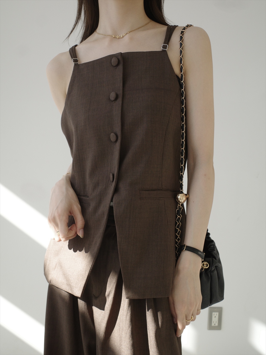 シンプルなのに、計算されたバランス。 スタイルアップが叶う一着。 【デザイン&ディテールポイント】 シンプルながらも存在感のある、大人のためのセットアップ。 ビスチェとワイドパンツのバランスにこだわり、スタイルアップと快適さを両立した一着です。 トップスはコンパクトに、ボトムはゆったりとしたシルエットにすることで、メリハリのあるスタイリングが完成。 セットで着るだけでコーディネートが決まり、忙しい日にも頼れるアイテムです。 それぞれ単品使いも可能で、着回し力の高さも魅力。 インナーを変えることでロングシーズン活躍し、カジュアルからきれいめまで幅広いシーンに対応します。 ブラウン、グレーの2色展開。 ※セットでの購入は単品買いに比べ2,800円お得に購入ができます。 セットアップ/グレーはこちら structure 2piece setup / grey 着用アイテム ビスチェ structure camisole bustier / brown パンツ double waist layered pants / brown ■bag ball chain shoulder bag / black ※その他のアイテムはモデル私物です。 ■素材 本体: ポリエステル99% ポリウレタン1% 別布: ポリエステル100% ■サイズ詳細(cm) ビスチェ: 着丈50 身巾42 裾巾49/53 パンツ: ウエスト63(ウエスト最大78) ヒップ120 裾巾29 股上28 股下69 ■原産国 中国 モデル身長 158cm