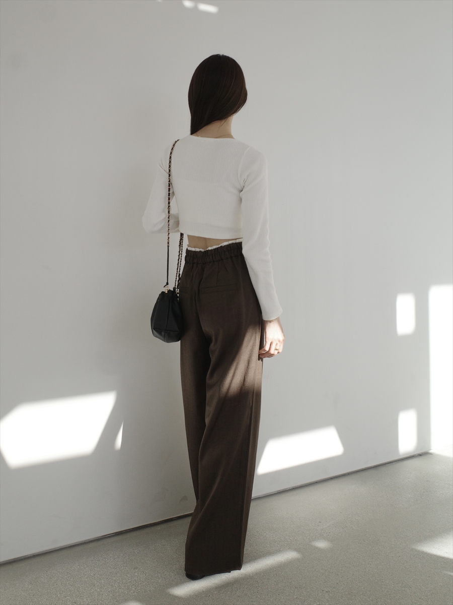 楽なのに綺麗。 大人が求める理想のワイドパンツ。 【デザイン&ディテールポイント】 リラックス感と美シルエットを両立した、ワイドストレートパンツ。 ウエストはバックゴム仕様でストレスフリーな履き心地ながら、 フロントはすっきりとしたデザインでカジュアルすぎない印象に仕上げました。 ウエストの異色レイヤードデザインもアクセントに。 程よくハリのある素材が、落ち感のあるシルエットをキープし、脚のラインを拾わずスタイルアップを実現。 タックデザインが腰回りにゆとりを持たせつつ、縦のラインを強調してくれるため、自然と脚長効果も期待できます。 オン・オフ問わず活躍し、トップス次第で幅広いスタイリングに対応可能。 同素材のビスチェとのセットアップで、より完成度の高いスタイルに。 ブラウン、グレーの2色展開。 ※セットでの購入は単品買いに比べ2,800円お得に購入ができます。 グレーはこちら double waist layered pants / grey セットアップ/ブラウンはこちら structure 2piece setup / brown セットアップ/グレーはこちら structure 2piece setup / grey 着用アイテム ■bag ball chain shoulder bag / black ※その他のアイテムはモデル私物です。 ■素材 本体: ポリエステル99% ポリウレタン1% 別布: ポリエステル100% ■サイズ詳細(cm) ウエスト63(ウエスト最大78) ヒップ120 裾巾29 股上28 股下69 ■原産国 中国 モデル身長 158cm