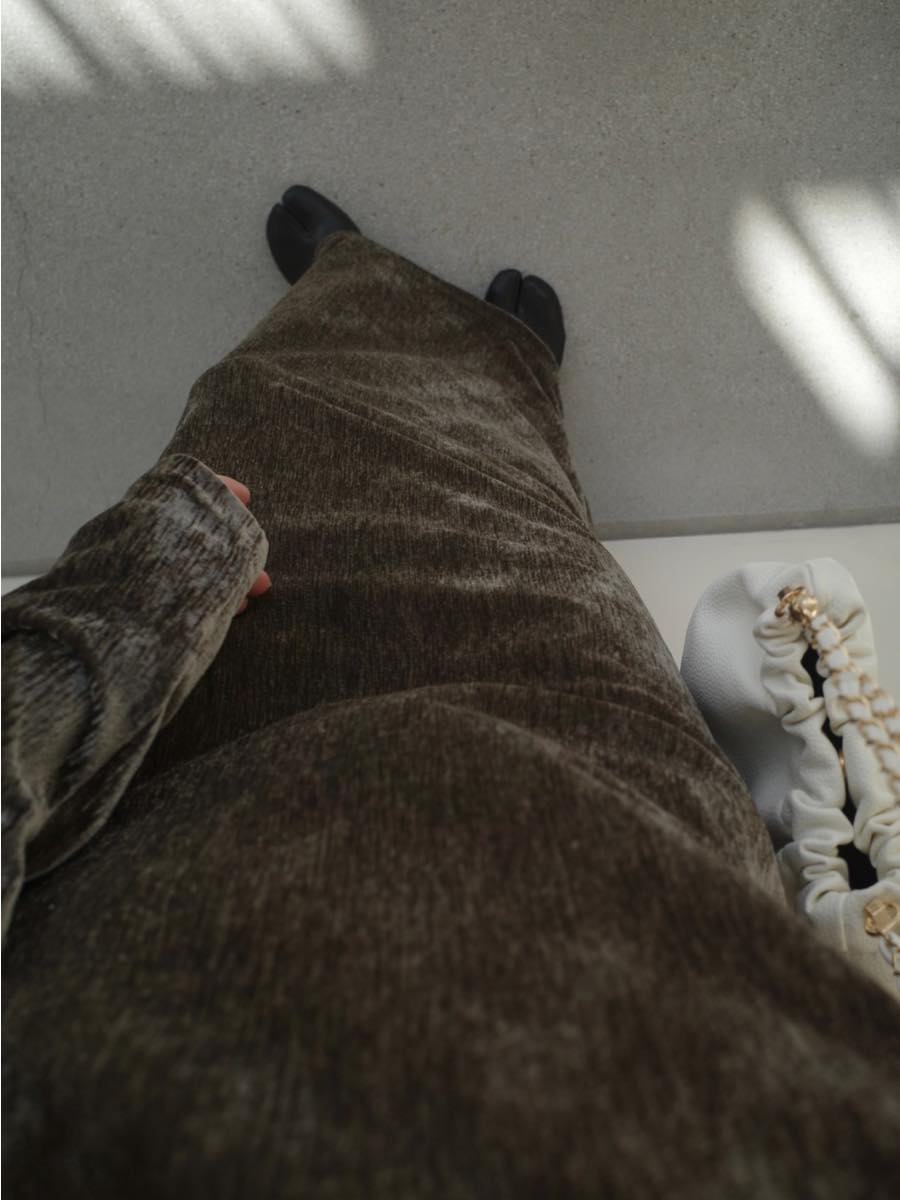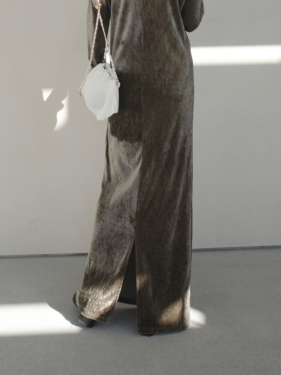 【デザイン&ディテールポイント】 シックなカーキのベロア素材を贅沢に使用したロングドレス。 フロントは上品なボートネックでミニマルに仕上げ、バックオープンデザインでヘルシーな肌見せも叶います。 裾のセンターバックスリットが歩くたびに美しい揺れを演出するほか、足捌きのしやすさもうれしいポイント。 ストレートラインで、身体のラインを拾いすぎず、スタイルアップが叶います。 【コーディネートポイント】 着るだけでコーディネートが完成する主役級ドレス。 足元は華奢なヒールのほか、ブーツを合わせるだけで秋仕様のスタイリングに。 アクセサリーをミニマルにまとめると、バックオープンの抜け感が引き立ちます。 アウターが羽織りやすいシンプルなデザインで、スタイリングの幅が広い一枚です。 ブラウンはこちら velvet back open dress / brown ※その他のアイテムはモデル私物です。 ■素材 ポリエステル:95% ポリウレタン:5% ■サイズ詳細(cm) 着丈:136 身巾:42 肩巾:35 袖丈:62.5 裾巾:47 ウエスト:38 ■原産国 中国 モデル身長 158cm