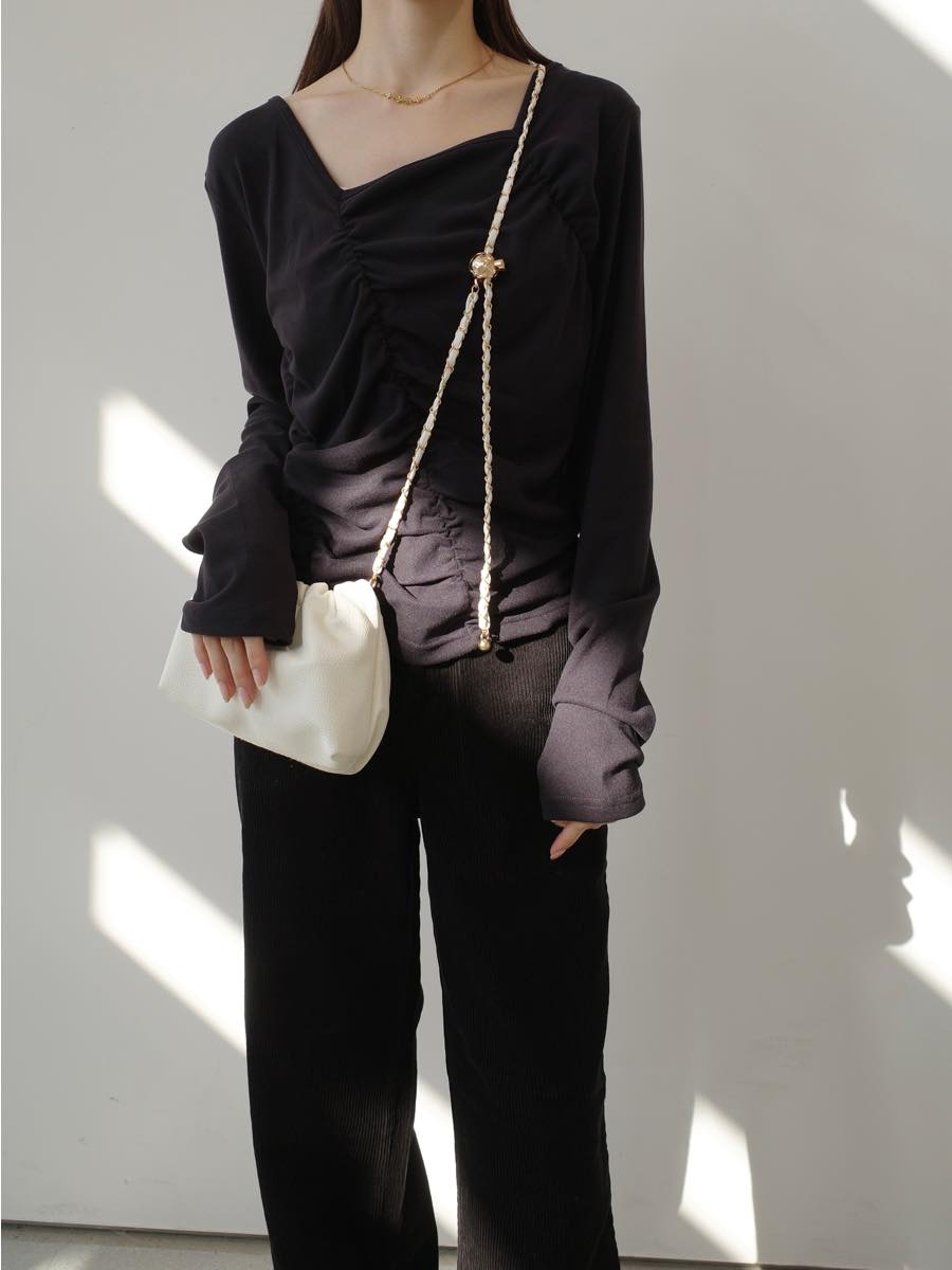 【デザイン&ディテールポイント】 落ち感の美しいピーチスキン素材が、優しく馴染むロングスリーブトップス。 センターに施された大胆なギャザーと、アシンメトリーなネックデザインが目を惹きます。 左右の襟ぐりの高さが異なり、首元に動きと抜け感をプラス。 立体的なドレープが、ボディラインを自然にカバーしつつ、フェミニンな印象を演出。 ダークグレー、グレー、アイボリーの三色展開です。 【コーディネートポイント】 1枚で主役になるデザインなので、シンプルなボトム合わせがおすすめ。 スラックスやデニムでカジュアルに、スカートで女性らしくも。 ジャケットのインナーとしても活躍し、コーディネートにモード感をプラスしてくれます。 トーンを合わせたアイテムとスタイリングすると、よりシックで洗練された印象に。 グレーはこちら peach skin asymmetry top / grey アイボリーはこちら peach skin asymmetry top / ivory 着用アイテム ■bag ball chain shoulder bag / ivory ※その他のアイテムはモデル私物です。 ■素材 ポリエステル92% ポリウレタン8% ■サイズ詳細(cm) 着丈50 バスト80 肩幅38 袖丈68 裾幅39 ■原産国 中国 モデル身長 158cm
