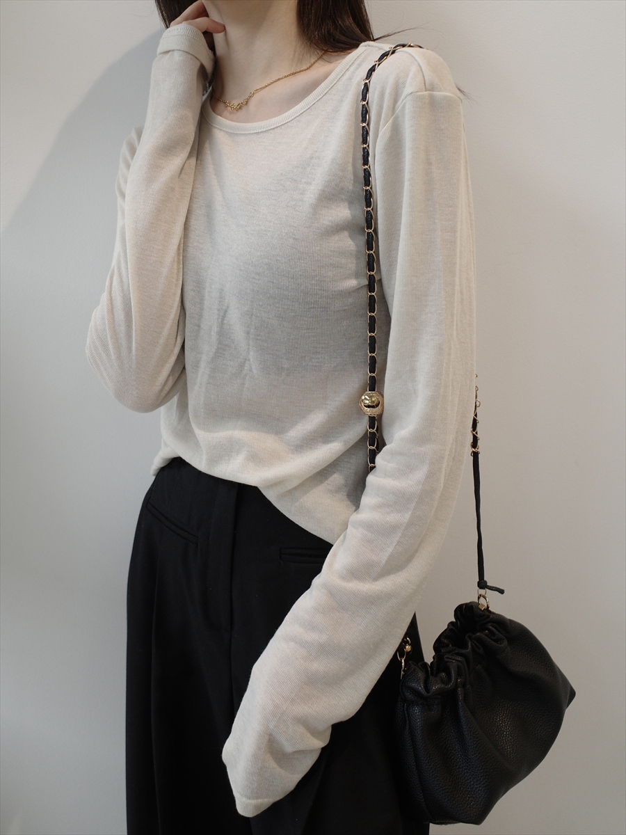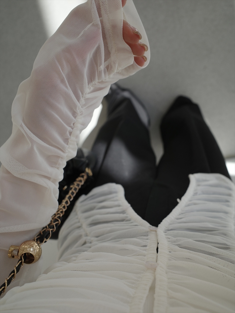 【デザイン&ディテールポイント】 繊細な透け感と立体的なシャーリングが目を惹く、レイヤードセットアイテム。 1枚で“完成されたスタイリング”が叶う、今季の主役トップスです。 フロントにたっぷりと施されたシャーリングデザインが、自然な立体感と女性らしいラインを演出。 ボディに沿うようにギャザーが寄ることで、華奢見えとこなれ感を両立します。 コンパクトなVネックカーディガンは、ボタンの開閉で印象を変えられる仕様。 さりげなく肌が覗く抜け感が、センシュアルすぎず上品にまとまります。 セットのインナーはシンプルなロングスリーブカットソー。 ややフィット感のあるシルエットで、レイヤード時にももたつかずすっきり着用可能。 カーディガンは軽やかなシアー素材。 ほんのり透ける質感が、季節の変わり目にも使いやすくロングシーズン活躍します。 インナーは柔らかく肌触りの良いカットソー素材で、ストレスフリーな着心地。 アイボリー×ベージュ、ブラック×ホワイトの2色展開。 【コーディネートポイント】 セットでの着用はもちろん、単体使いも可能な着回し力の高さが魅力。 ・デニムと合わせてカジュアルダウン ・スラックスやスカートでモードに ・ワンピースの羽織としても◎ カーディガンは前を開けて軽い羽織としても使えるため、スタイリングの幅が広がります。 ブラック×ホワイトはこちら 2piece layered sheer tops / black & white 着用アイテム ■pants sheer flower lace pants / black ■pants pocket design tuck pants ■bag ball chain shoulder bag / black ※その他のアイテムはモデル私物です。 ■素材 シアートップス: ポリエステル95% ポリウレタン5% インナー: ポリエステル87% レーヨン13% ■サイズ詳細(cm) シアートップス: 着丈55 身巾40 肩幅36 袖巾16 袖丈65 袖口10 インナー: 着丈55 身巾42 肩幅39 袖丈66 袖口10.5 裾巾41 ■原産国 中国 モデル身長 158cm