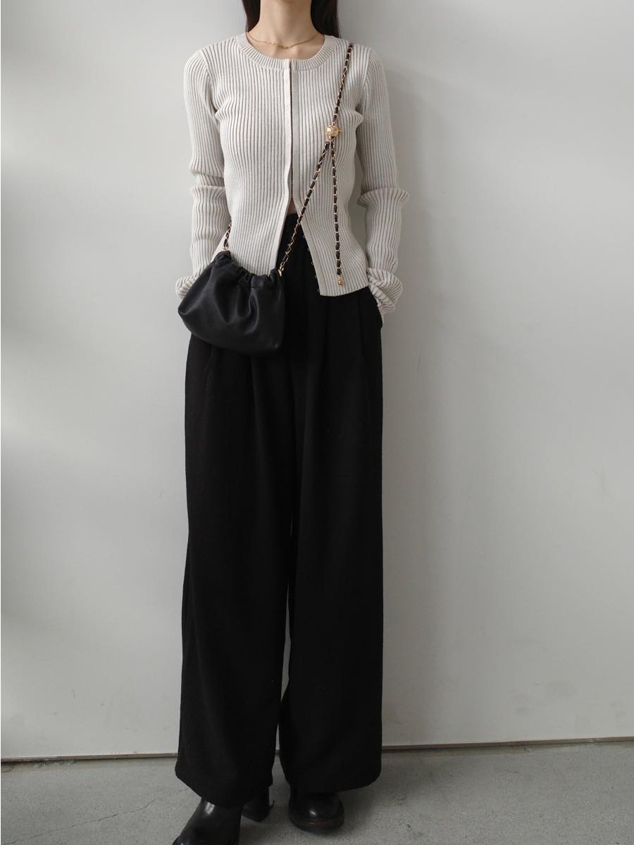 【デザイン&ディテールポイント】 程よく体に沿うリブ編みが上品な印象を与えるカーディガン。 フロントに並んだフックボタンが、さりげないディテールで洗練された印象に。 手元にかけてやや長めにデザインされた袖は、自然と抜け感を演出。 シンプルながらもディテールにこだわりを感じる一着です。 ベージュ、アイボリーの二色展開。 【コーディネートポイント】 春先や秋口には1枚で、冬にはアウターの中に重ねてもごわつかず、ロングシーズン活躍するアイテム。 ブラックのボトムでメリハリをつけたコーデや、同系色でまとめたワントーンコーデもおすすめ。 カーディガンとしてはもちろん、フックをすべて留めて、リブトップスのように着こなすのも◎ ベージュはこちら hook line rib cardigan / beige ※その他のアイテムはモデル私物です。 ■素材 ポリエステル:85% アクリル:9% ナイロン:6% ■サイズ詳細(cm) 着丈:52 バスト:64 肩巾:31 袖丈:65 裾巾:30 ■原産国 中国 モデル身長 158cm