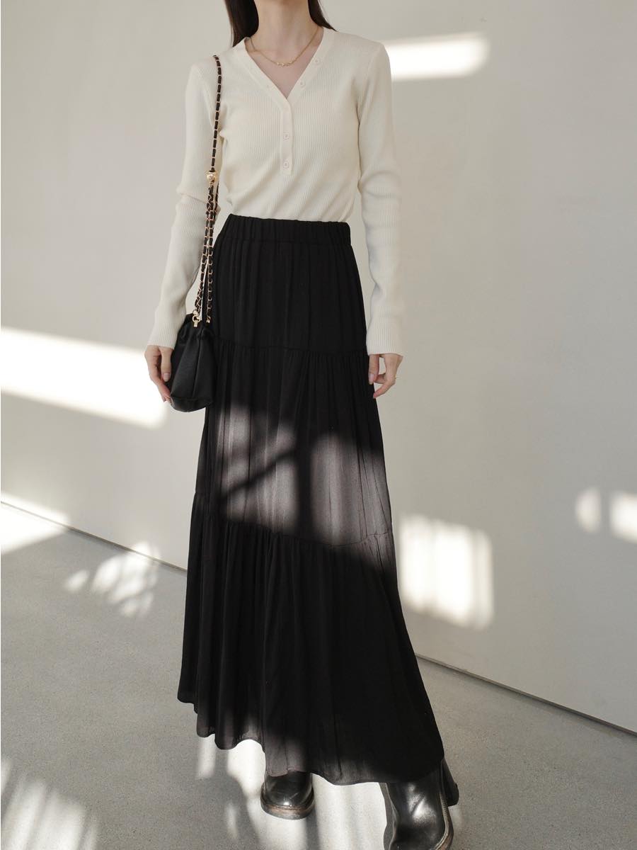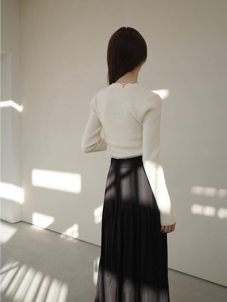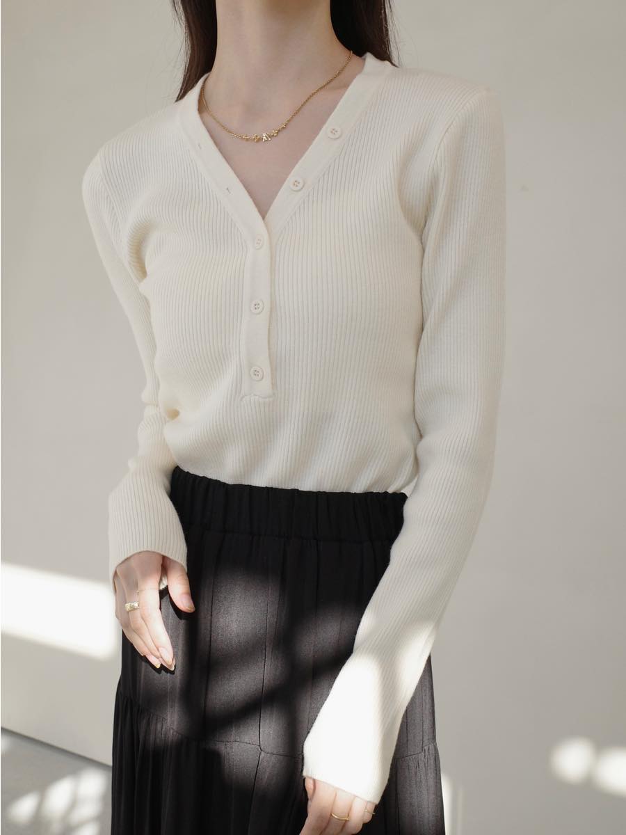 【デザイン&ディテールポイント】 上品なアイボリーカラーが魅力のリブニット。 程よく身体にフィットするリブ素材は、縦ラインを強調しつつも女性らしい印象を与えてくれます。 Vネックと小さめのボタンが、シンプルながらも洗練されたアクセントに。 袖口はやや長めにデザインされ、手元に抜け感を演出します。 オールシーズン着られる素材感は、ワードローブのマストアイテム。 【コーディネートポイント】 1枚で着るのはもちろん、すっきりとしたデザインは上からアウターを羽織っても◎。 ブラックのボトムと合わせることで、シックで洗練された印象が叶います。 シンプルなデザインだからこそ、アクセサリーや小物使いも楽しめる一枚。 ベージュはこちら button v neck cardigan / beige ※その他のアイテムはモデル私物です。 ■素材 ポリエステル50% アクリル30% ナイロン20% ■サイズ詳細(cm) 着丈57.5 肩幅33 袖幅60 バスト72 ■原産国 韓国 モデル身長 158cm