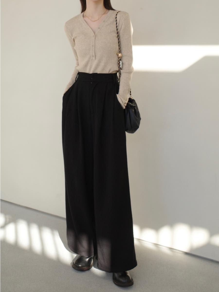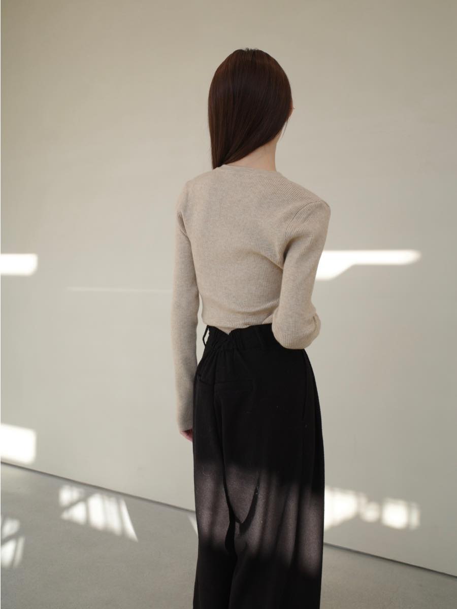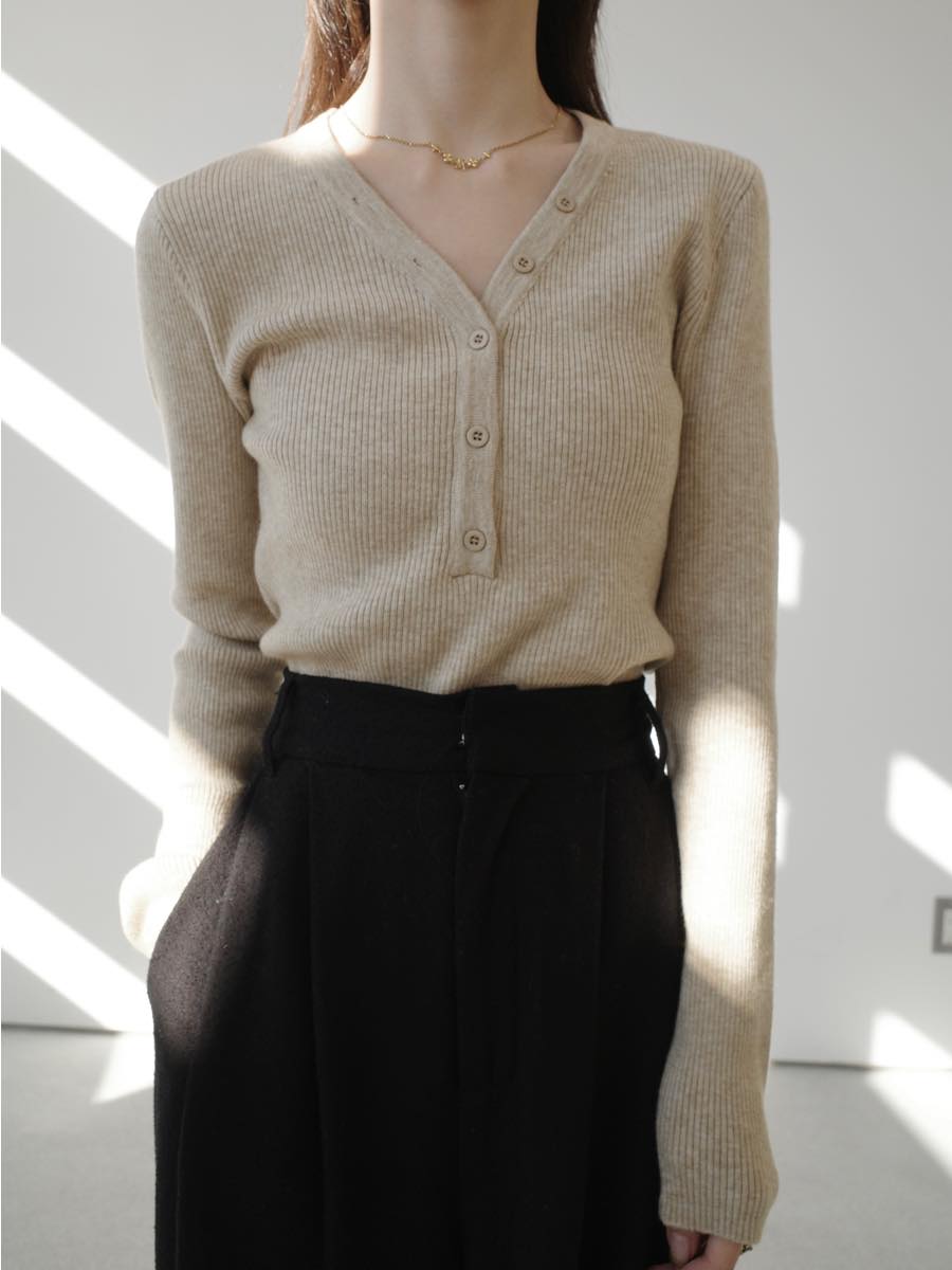 【デザイン&ディテールポイント】 肌なじみの良いナチュラルなベージュカラーが魅力のVネックニット。 華奢なリブ編みがほどよくボディラインにフィットし、大人フェミニンな印象に。 ミニマルなボタンデザインとすっきりとしたネックラインで、デコルテをきれいに見せてくれます。 少し長めにデザインされた袖口で女性らしさをプラス。 【コーディネートポイント】 ブラックのボトムスとスタイリングすることで、落ち着きのある大人カジュアルスタイルに。 シンプルなデザインは合わせるボトムを選ばず、様々なシーンで着回しの叶う一枚。 アイボリーはこちら button v neck cardigan / ivory ■pants boucle tuck pants / black ※その他のアイテムはモデル私物です。 ■素材 ポリエステル50% アクリル30% ナイロン20% ■サイズ詳細(cm) 着丈57.5 肩幅33 袖幅60 バスト72 ■原産国 韓国 モデル身長 158cm