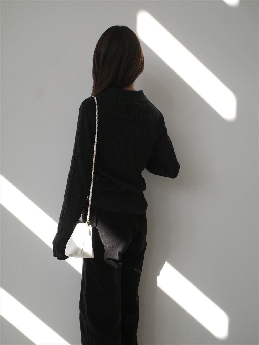 【デザイン&ディテールポイント】 縦ラインを強調するリブ編みが、身体のラインを美しく見せてくれるポロデザインニットトップス。 コンパクトすぎない程よいフィット感で、1枚でもインナーとしても着回しやすい万能アイテムです。 程よく開いたフロントのボタンデザインが、抜け感と女性らしさを演出。 襟付きデザインながらも硬さはなく、カジュアルからきれいめまで幅広く対応します。 デコルテがきれいに見える前立てボタンと、縦リブで細見え効果抜群。 さりげない襟付きデザインで上品さをプラス。 ヒップにかかる絶妙な丈感でスタイルカバー。 しなやかで肌なじみが良く、長時間着用でもストレスフリー。 アイボリー、チャコールの2色展開。 【コーディネートポイント】 スラックスやデニムで大人カジュアルに。 ジャケットのインナーとしてオフィスカジュアルにもおすすめ。 ボタンを少し開けて女性らしい着こなしも◎ アイボリーはこちら button neck polo knit / ivory 着用アイテム ■pants corduroy long pants ■bag ball chain shoulder bag / ivory ※その他のアイテムはモデル私物です。 ■素材 ポリエステル50% ナイロン40% ウール10% ■サイズ詳細(cm) 着丈58 肩幅35 袖丈60 バスト76 ■原産国 中国 モデル身長 158cm