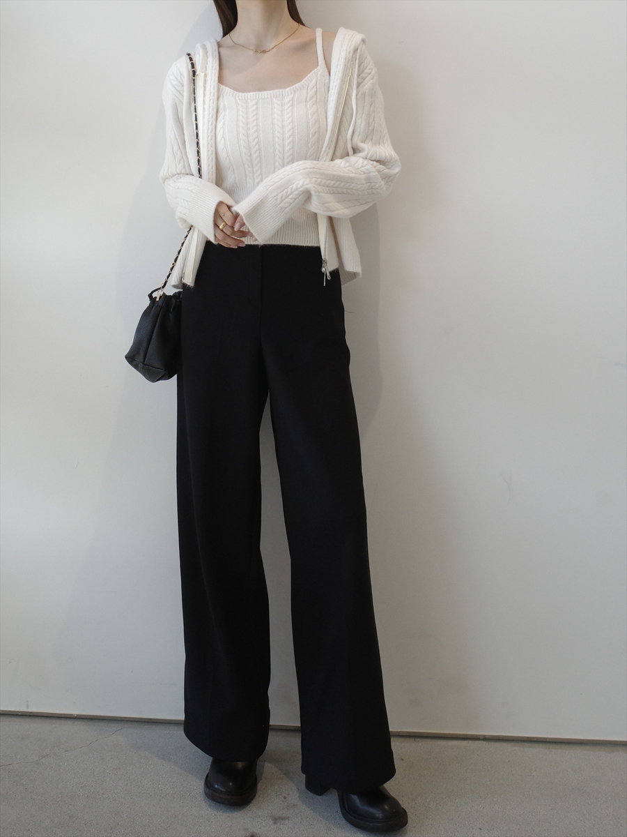 【デザイン&ディテールポイント】 立体感のあるケーブル編みが魅力の、ニットパーカーとキャミソールのセットアイテム。 パーカーは程よくコンパクトなシルエット。 縦に入ったケーブル編みが自然なラインを強調し、カジュアルながらも女性らしい印象に仕上げています。 フロントはジップ仕様で、開けてラフに羽織るスタイルもおすすめ。 フード付きで抜け感をプラスしつつ、上品な編み地が大人っぽさをキープします。 インナーのキャミソールは同素材のケーブル編み。 広めに開いたネックラインがデコルテを美しく見せ、華奢なストラップが女性らしさを引き立てます。 ウエスト部分は程よくフィットし、自然なメリハリを演出。 アイボリー、グレー、ブラックの3色展開。 【コーディネートポイント】 セットで着れば統一感のあるスタイリングに。 それぞれ単品使いも可能で、パーカーはデニムやスラックスに、キャミはシャツやジャケットのインナーとしても活躍します。 グレーはこちら camisole set cable knit hoodie / grey ブラックはこちら camisole set cable knit hoodie / black 着用アイテム ■pants fleece lined tuck pants ■bag ball chain shoulder bag / black ※その他のアイテムはモデル私物です。 ■素材 アクリル50% ポリエステル30% ナイロン20% ■サイズ詳細(cm) 着丈(カーディガン50 キャミ41) 肩幅(カーディガン38 キャミ23) 袖丈59 バスト(カーディガン60 キャミ92) ■原産国 中国 モデル身長 158cm