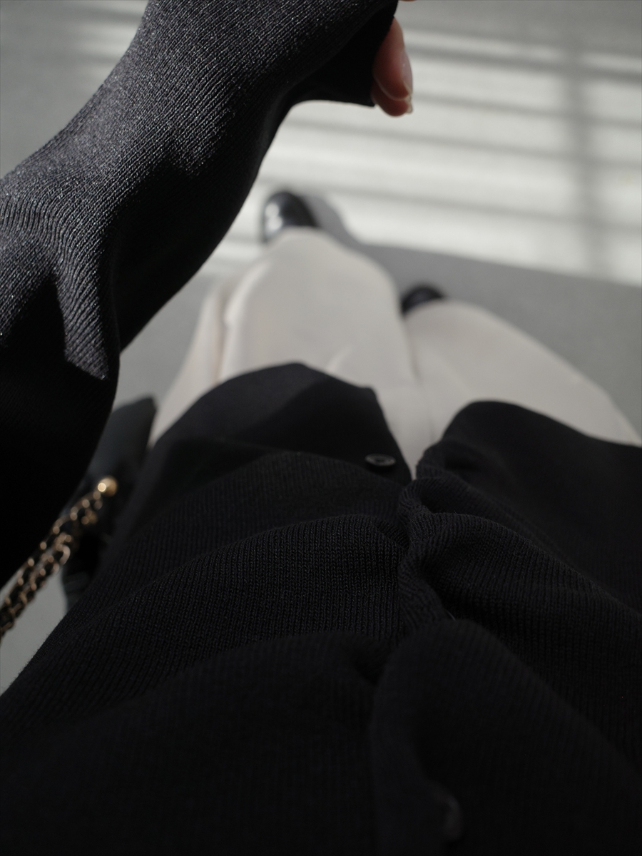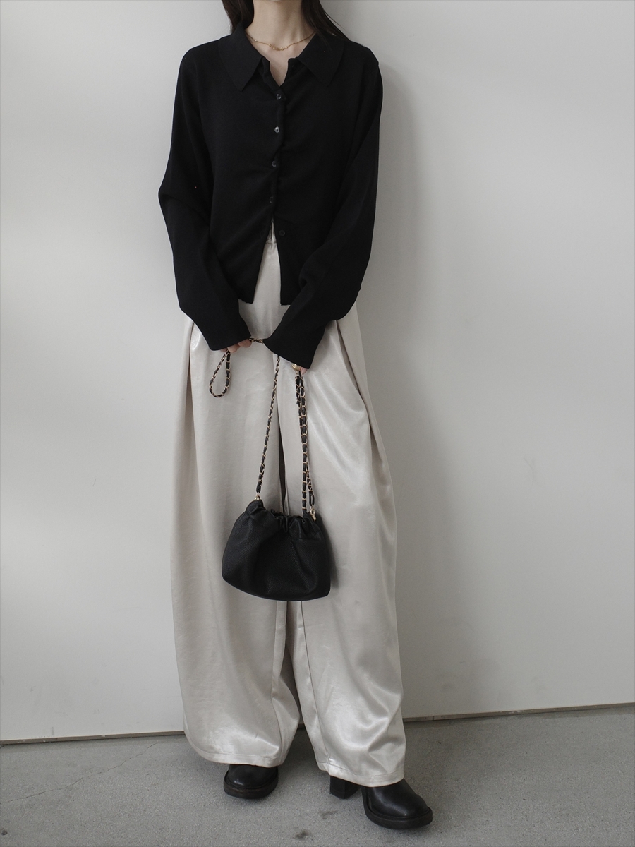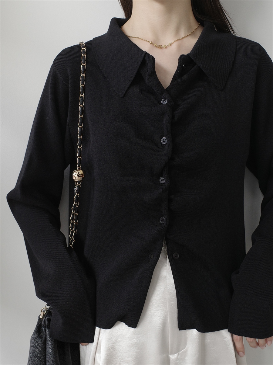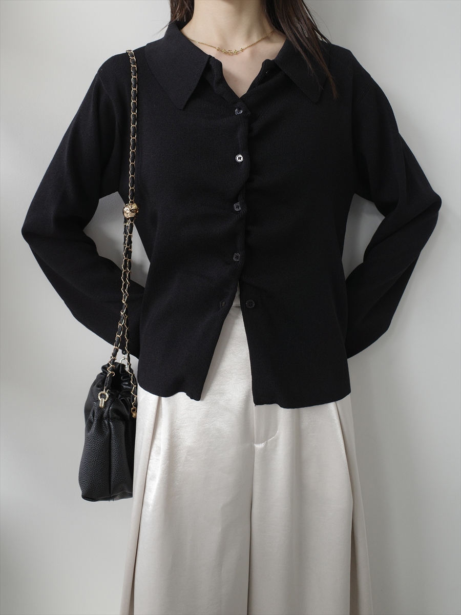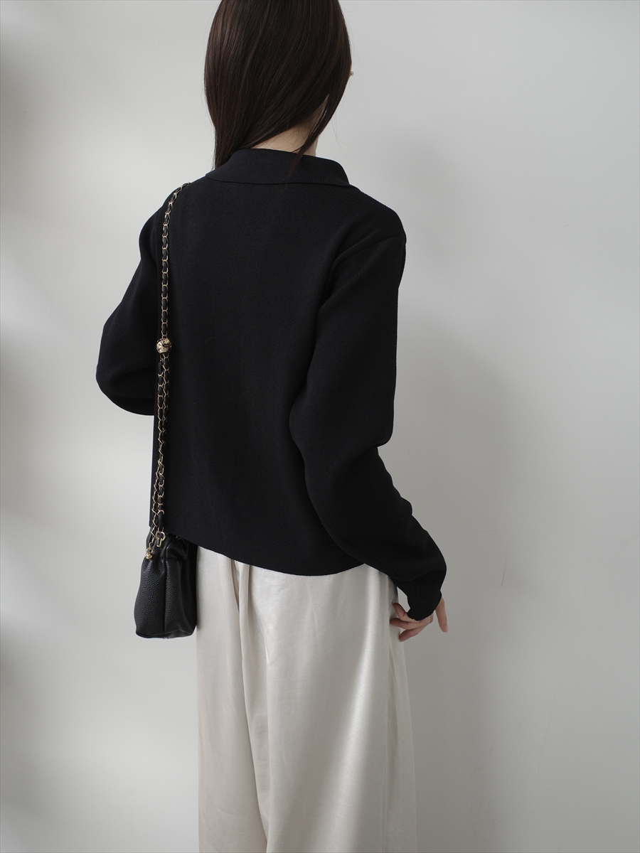 【デザイン&ディテールポイント】 程よく身体に沿うシルエットが女性らしさを引き立てる、襟付きリブニットカーディガン。 コンパクトながらも窮屈感のないサイズ感で、1枚着としても羽織としても活躍する万能アイテムです。 細かなリブ編みが縦ラインを強調し、スタイルアップ効果も◎ やや大きめに設計された襟デザインが、顔まわりに抜け感ときちんと感をプラスします。 フロントはボタン仕様で、留め方次第で表情を変えられるのもポイント。 柔らかく滑らかな肌触りのニット素材を使用し、長時間の着用でもストレスフリー。 アイボリー、グレー、ブラックの3色展開。 【コーディネートポイント】 シンプルなブラックパンツと合わせれば洗練された大人コーデに、 デニムやスカートと合わせればカジュアルダウンも可能です。 アイボリーはこちら twist placket polo knit / ivory グレーはこちら twist placket polo knit / grey 着用アイテム ■bag ball chain shoulder bag / black ※その他のアイテムはモデル私物です。 ■素材 ポリエステル60% レーヨン40% ■サイズ詳細(cm) 着丈51 肩幅35 袖丈63 バスト164 ■原産国 中国 モデル身長 158cm