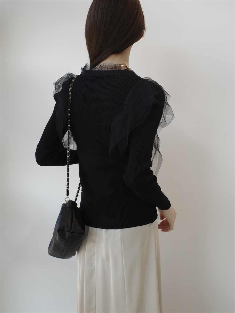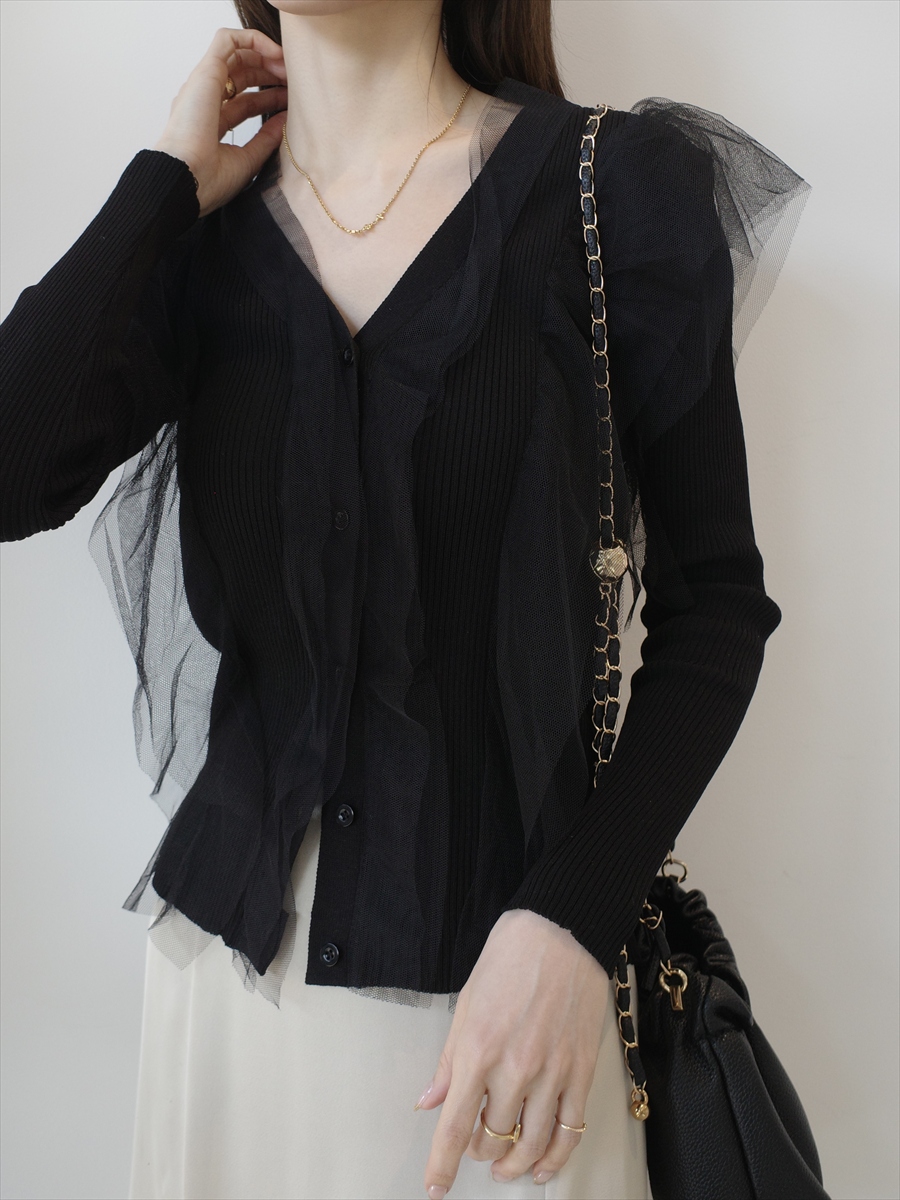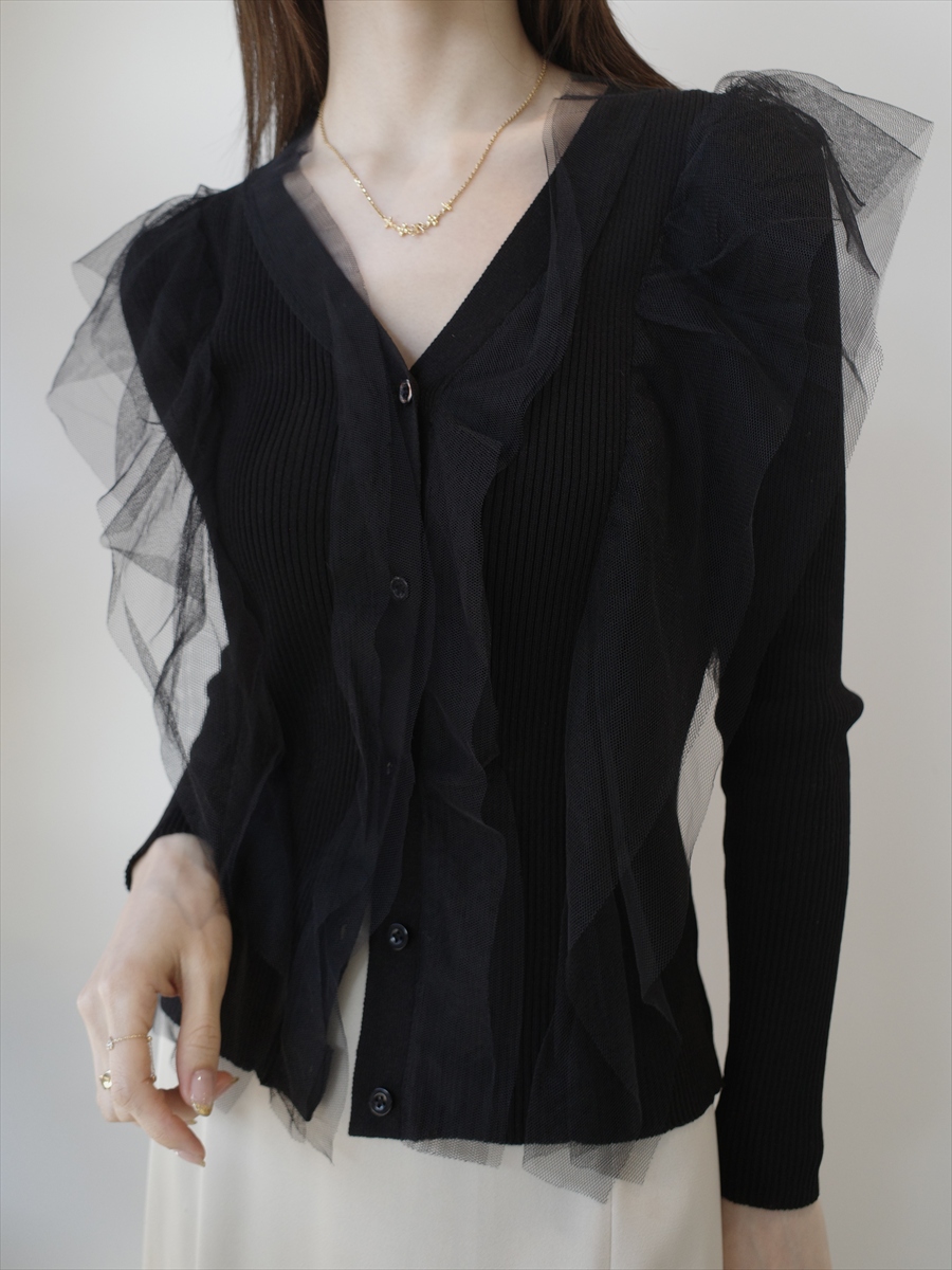 TOPページ > Tops > Knit > 【NEW】tulle frill rib knit cardigan / black