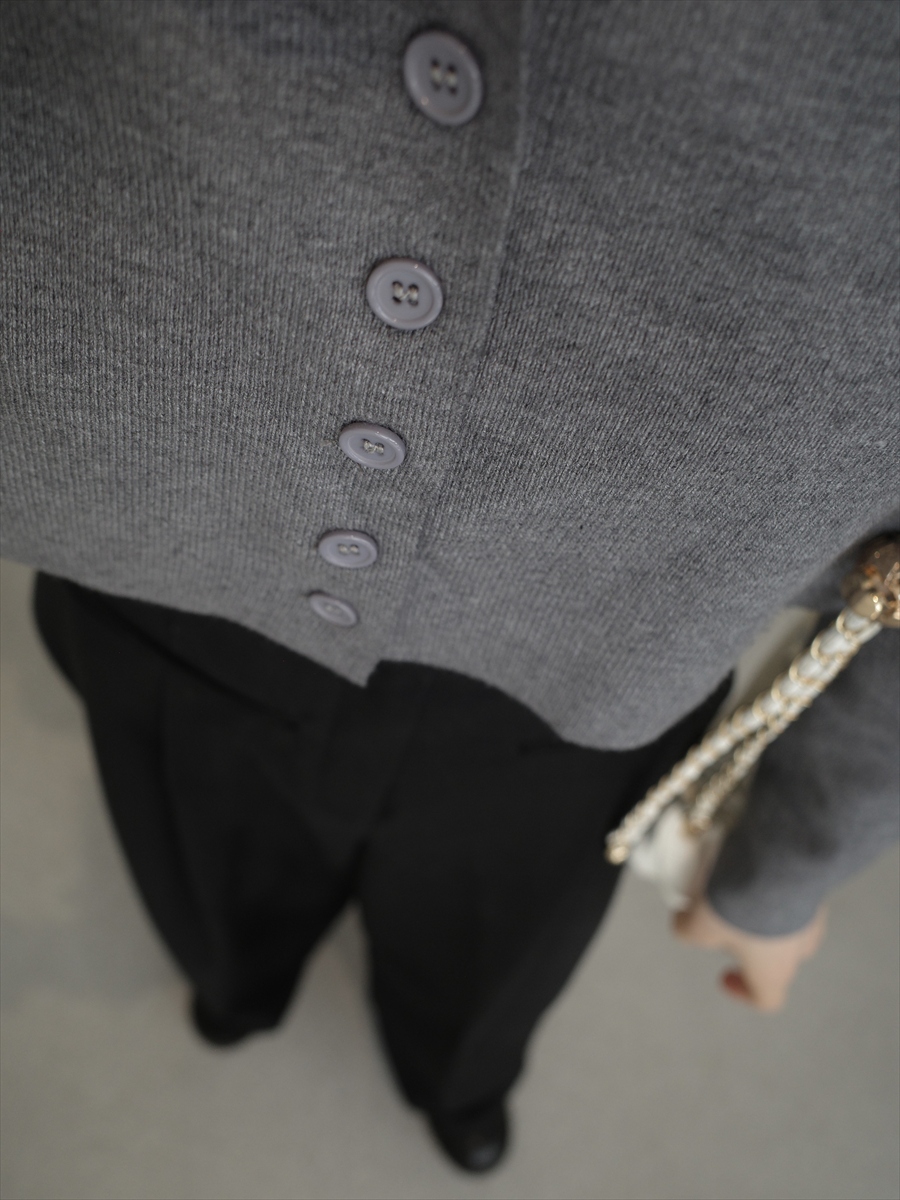 【デザイン&ディテールポイント】 コンパクトな丈感でバランス良く着こなせる、ミニマルなリブカーディガン。 無駄を削ぎ落としたシンプルなデザインに、フロントの小さなボタンがさりげないアクセントに。 浅めのVネックがデコルテをきれいに見せ、女性らしい抜け感を演出します。 程よくフィットする細リブ素材は、柔らかく伸縮性があり着心地も抜群。 身体のラインを拾いすぎない絶妙なサイジングで、コンパクトながら上品な印象に仕上げています。 スタイルアップ効果があり、ウエスト位置を自然に高く見せてくれます。 シーズン問わず活躍する、ワードローブに加えたいベーシックアイテム。 アイボリー、グレーの2色展開。 【コーディネートポイント】 トレンド感のあるクロップド丈は、ハイウエストボトムとの相性が抜群。 ワイドパンツで大人カジュアルにも。 タイトスカート合わせで女性らしく。 ボタンを閉めてトップス風にも、羽織としても着用可能。 アイボリーはこちら cropped knit cardigan / ivory 着用アイテム ■pants pocket design tuck pants ■bag ball chain shoulder bag / ivory ※その他のアイテムはモデル私物です。 ■素材 アクリル100% ■サイズ詳細(cm) 着丈34 肩幅36 袖丈52 バスト96 ■原産国 中国 モデル身長 158cm