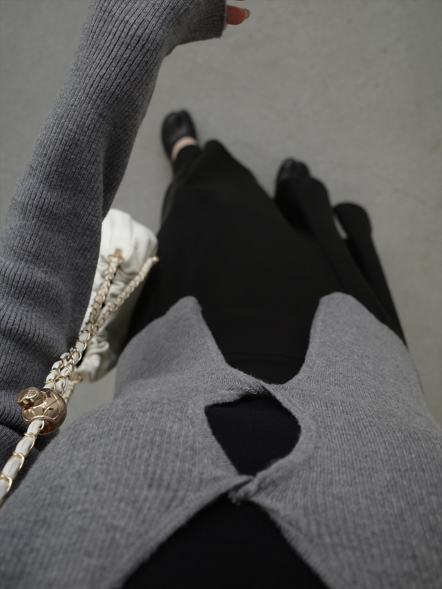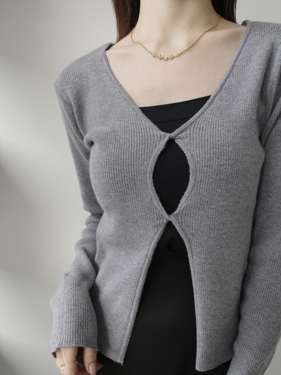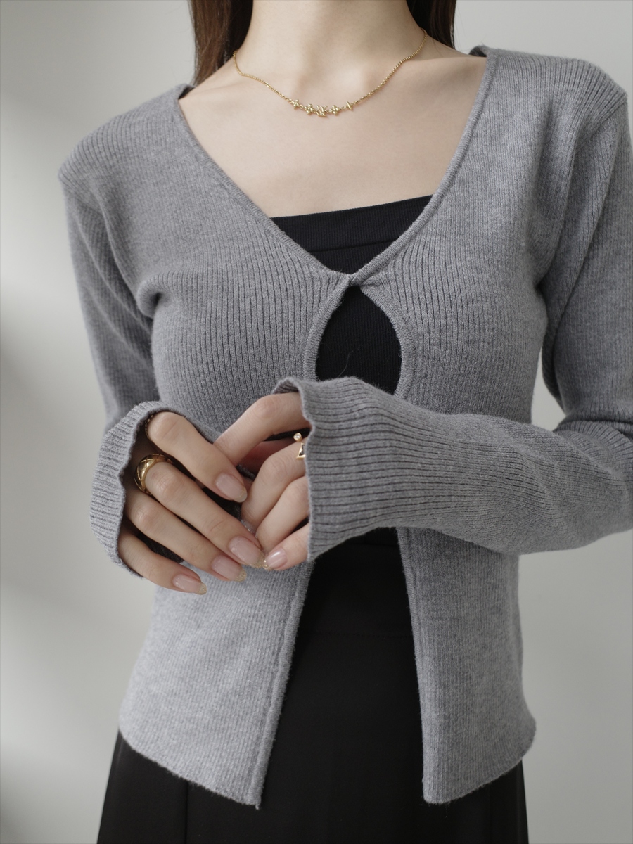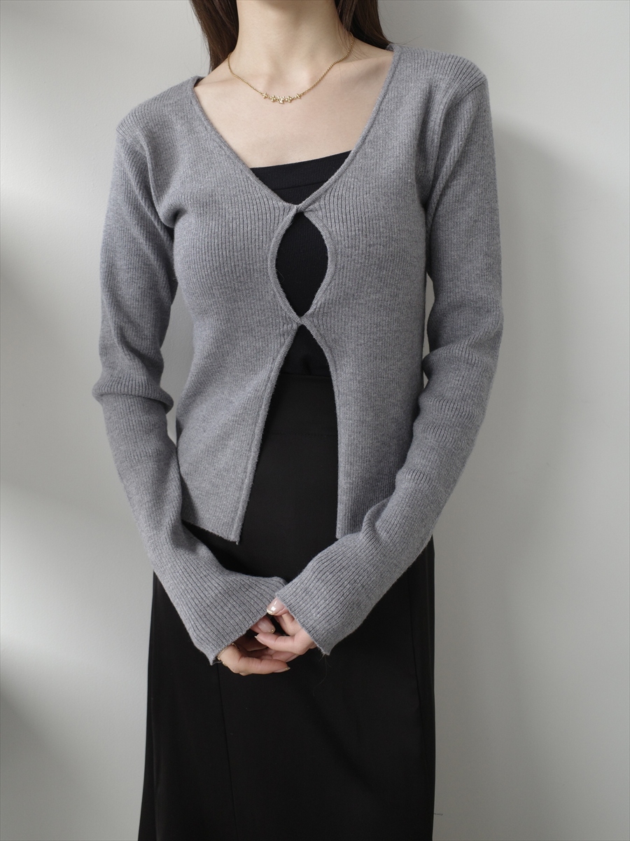 【デザイン&ディテールポイント】 フロントのカットアウトデザインが印象的なリブニットカーディガン。 シンプルな中にさりげない個性を取り入れた、大人のためのデザインニットです。 体にほどよくフィットするリブ編み素材を使用し、女性らしいシルエットを引き立てる一枚。 柔らかく伸縮性のある生地で、快適な着心地と美しいラインを両立しています。 フロント部分には、縦に並んだカットアウトデザインを採用。 さりげない肌見せが抜け感を生み、シンプルながらもコーディネートのアクセントになります。 インナーにキャミソールやベアトップを合わせることで、レイヤードスタイルを楽しめます。 やや長めの袖丈が手元にニュアンスを加え、こなれた印象に。 コンパクトな丈感で、スカートやワイドパンツなど様々なボトムとバランス良く合わせられます。 デイリー使いしやすいカラーで、モノトーンコーデやニュートラルカラーとの相性も抜群。 シンプルながらも一枚でスタイリングを引き締めてくれるアイテムです。 グレー、ブラックの2色展開。 【コーディネートポイント】 キャミワンピースの上から羽織るレイヤードスタイル ハイウエストボトムと合わせてスタイルアップ ジャケットのインナーとしてもおすすめ ブラックはこちら twist design knit top / black 着用アイテム ■bag ball chain shoulder bag / ivory ※その他のアイテムはモデル私物です。 ■素材 レーヨン51% ポリエステル30% ナイロン19% ■サイズ詳細(cm) 着丈50 肩幅36 袖丈62 バスト76 ■原産国 中国 モデル身長 158cm